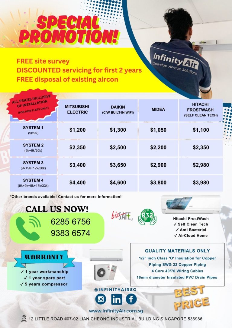 Infinity Air’s Special Promotion for New Aircon: Call us 6285 6756 or WhatsApp us at 9383 6574 to book your set today!